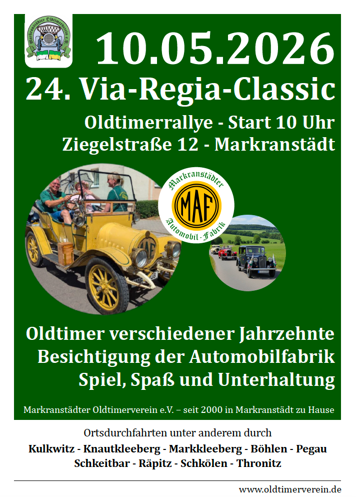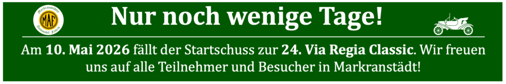 Es geht wieder los! Die Vorbereitungen zur 24. Auflage der Via-Regia-Classic laufen schon. Am 10.05.2026 geht unsere Oldtimerrallye in die nächste Runde. Oldtimerbegeisterte Fahrer und Fans, sichert euch den Termin schon mal im Kalender.